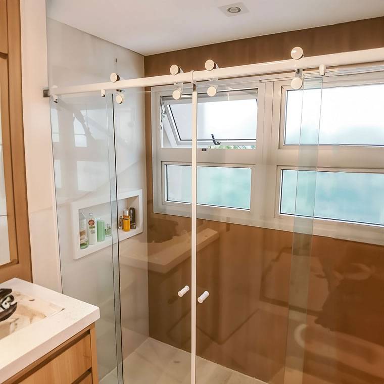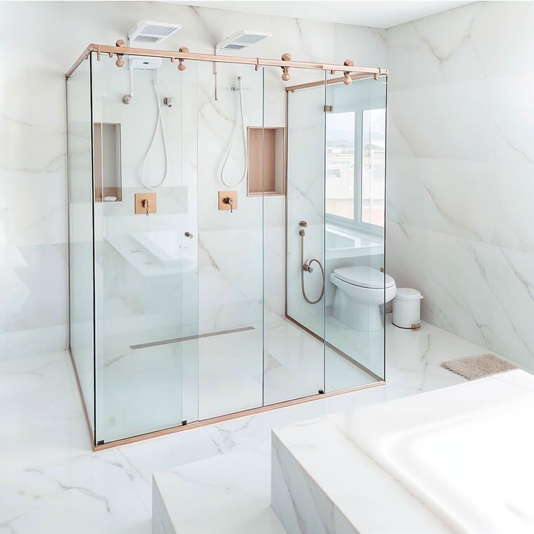 Banheiros grandes têm o luxo do espaço, mas o que realmente os eleva a outro nível é como esse espaço é utilizado. O Box de Vidro para Banheiro Elegance Due é a peça-chave para essa transformação, trazendo o sistema de roldanas aparentes diretamente do design do Box Elegance. Isso não só adiciona um toque de sofisticação ao ambiente como garante uma abertura de porta suave, ampla e extremamente convidativa. Seja alocado ao centro ou nas laterais, o Box Due é a porta de entrada para um novo mundo de conforto.